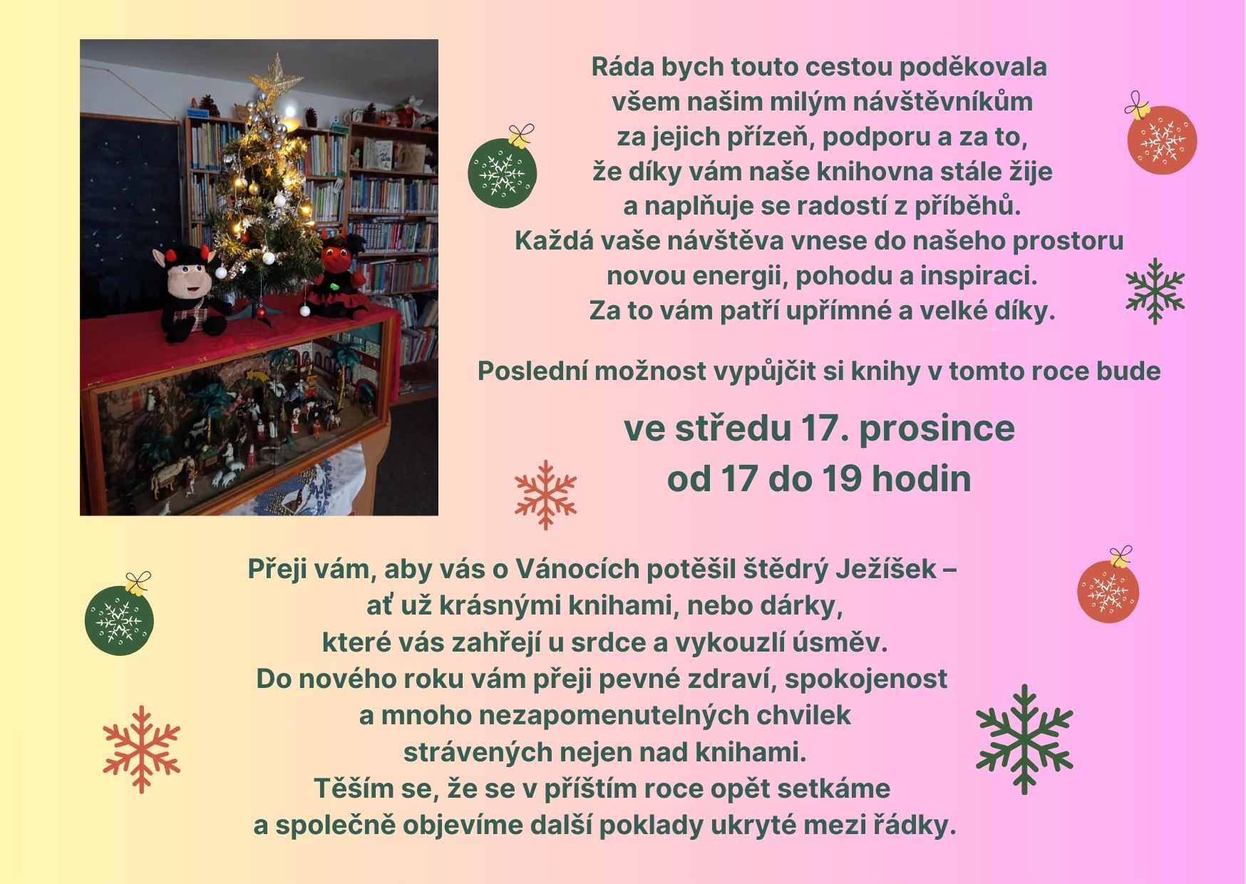 Ráda bych touto cestou poděkovala všem našim milým návštěvníkům za jejich přízeň, podporu a za to, že díky vám naše knihovna stále žije a naplňuje se radostí z příběhů.